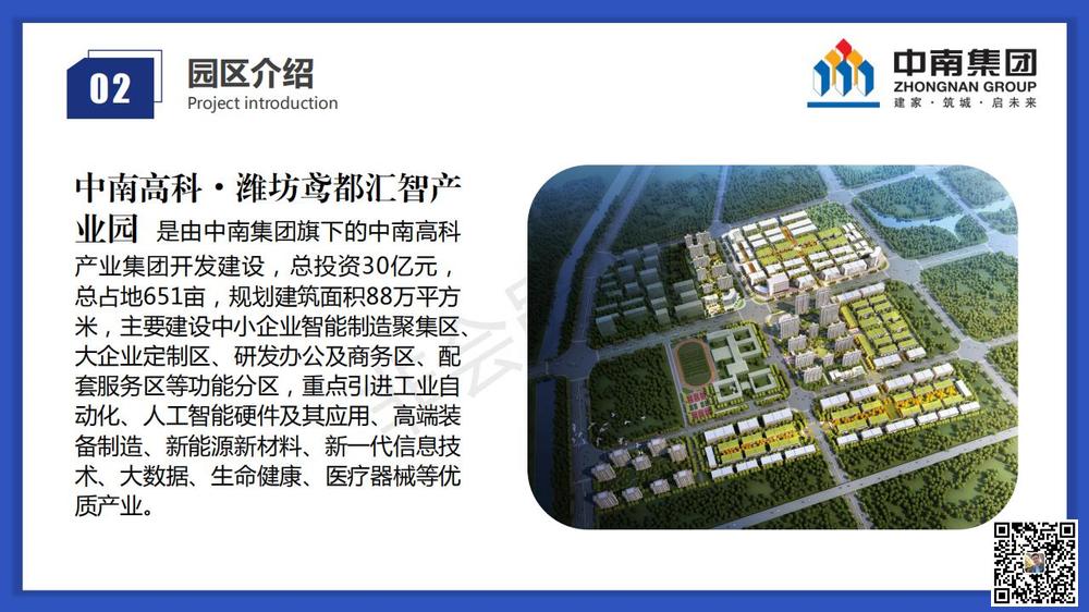 是由中南集團(tuán)旗下的中南高科產(chǎn)業(yè)集團(tuán)開發(fā)建設(shè),總投資30億元, 總占地651畝,規(guī)劃建筑面積88萬平方 米,主要建設(shè)中小企業(yè)智能制造聚集區(qū)、 大企業(yè)定制區(qū)、研發(fā)辦公及商務(wù)區(qū)、配 套服務(wù)區(qū)等功能分區(qū),重點(diǎn)引進(jìn)工業(yè)自動化、人工智能硬件及其應(yīng)用、高端裝 備制造、新能源新材料、新一代信息技 術(shù)、大數(shù)據(jù)、生命健康、醫(yī)療器械等優(yōu) 質(zhì)產(chǎn)業(yè)。