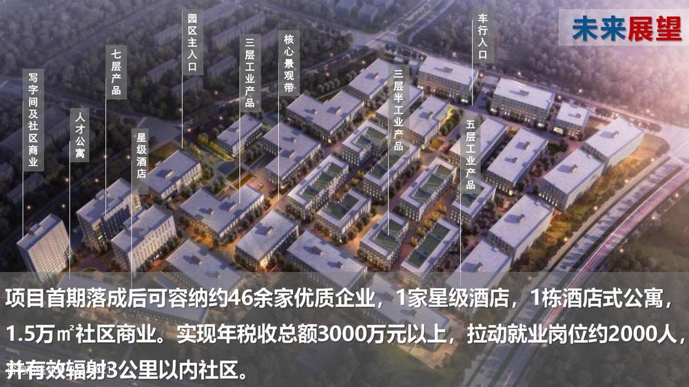 項(xiàng)目首期落成后可容納約46余家優(yōu)質(zhì)企業(yè),1家星級酒店,1棟酒店式公寓,1.5萬平方米社區(qū)商業(yè)。實(shí)現(xiàn)年稅收總額3000萬元以上,拉動就業(yè)崗位約2000人,并有效輻射3公里以內(nèi)社區(qū)。
