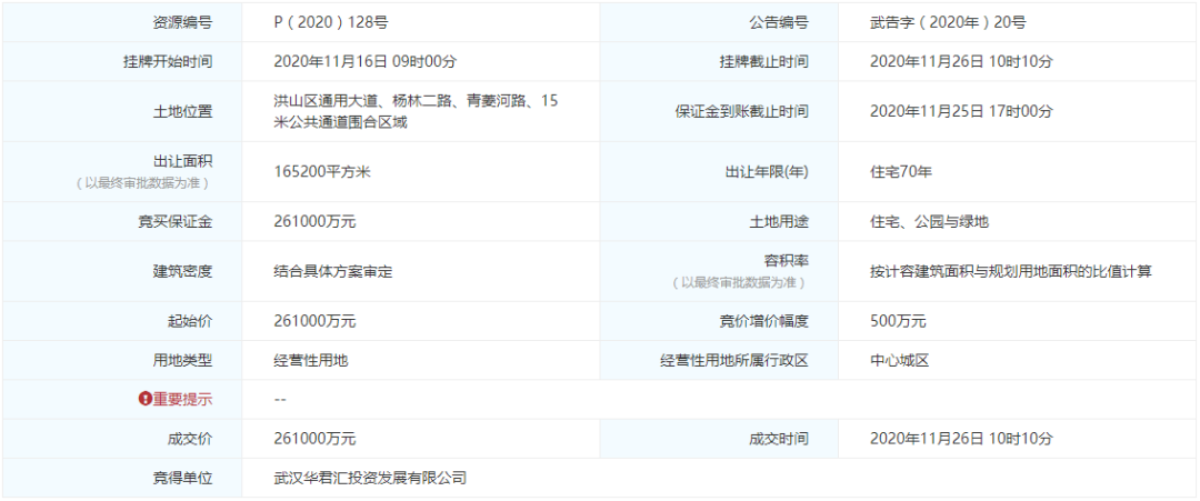 該地塊于11月26日開始限時(shí)競價(jià),因僅有大華一家報(bào)名,蕞終P(2020)128號地塊由武漢華君匯投資發(fā)展有限公司(大華)以底價(jià)261000萬元競得,成交樓面價(jià)為6055.68元/㎡。
