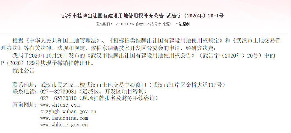 據(jù)土地情報(bào)數(shù)據(jù)監(jiān)測顯示,11月26日,武漢市兩宗住宅用地、兩宗綜合用地(含住宅)出讓。原定于今天出讓的P(2020)129號地塊撤銷掛牌出讓。