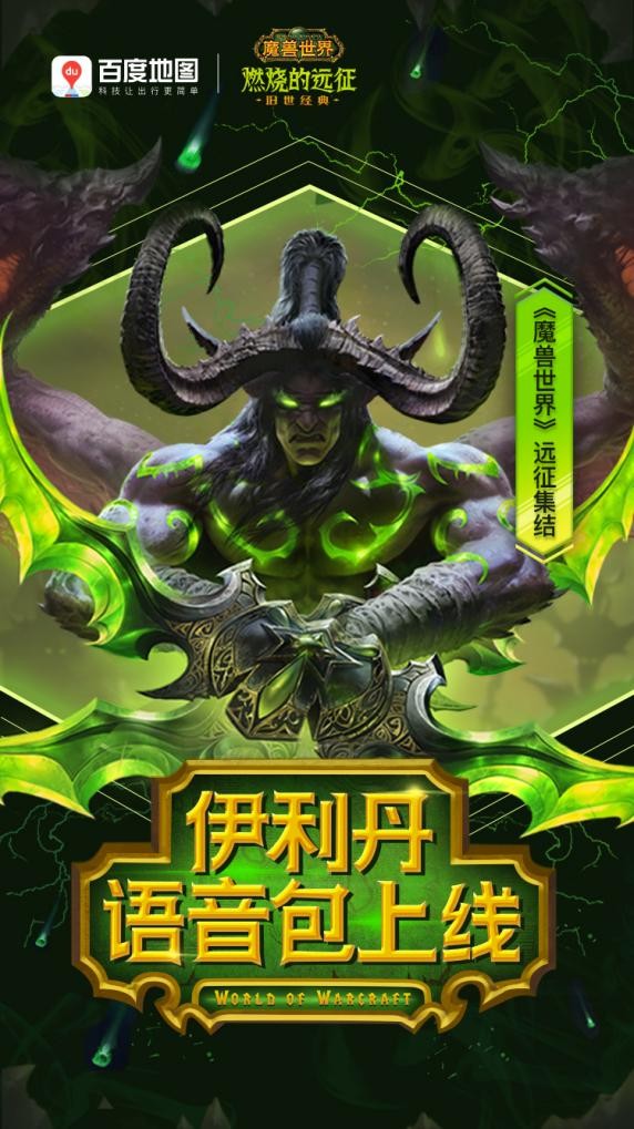 遠征已開啟,與伊利丹一同狩獵!近日,百度地圖獨家上線《魔獸世界》伊利丹怒風語音包,帶領(lǐng)用戶穿越到游戲世界,與伊利丹一同“遠征”。用戶只需在百度地圖首頁搜索“伊利丹”關(guān)鍵詞,或喚醒“小度小度”后說“伊利丹“,即可下載體驗。