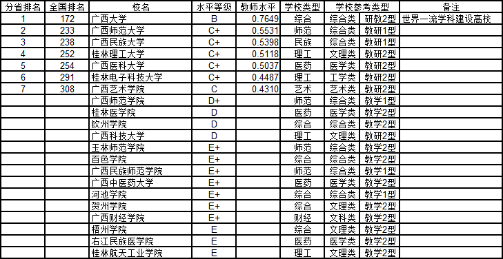 廣西壯族自治區(qū)面積23.6萬平方公里,人口4796萬人,人均GDP:35036元。2018年共評(píng)價(jià)21所普通本科大學(xué)。教師20351人,在校博士生855人,碩士生23927人,普通本科生250630人。