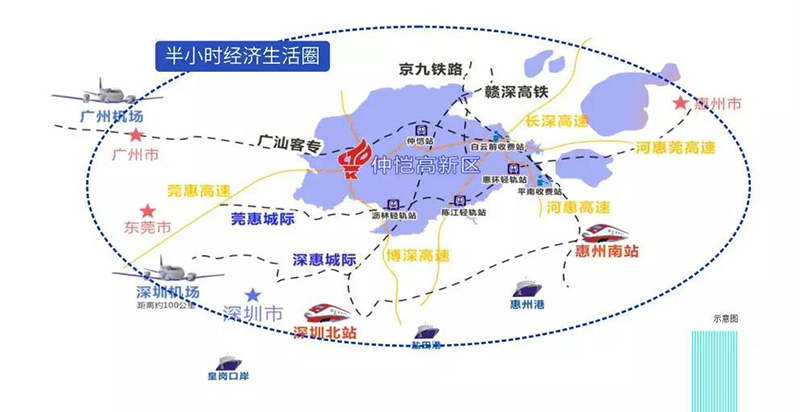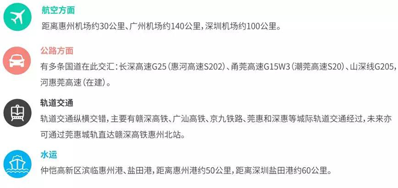 距廣州、深圳、香港中心區(qū)約60-100公里,集航空、軌道、高速公路和水陸運輸全方位、 立體化綜合交通體系,交通快捷便利,打造深莞惠“半小時經(jīng)濟生活圈”。