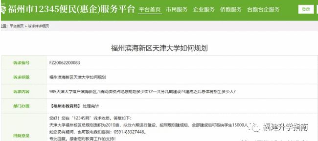 2020年6月,有網(wǎng)友在福州12345便民(惠)企服務平臺咨詢校區(qū)建設情況:“請問天津大學福州國際校區(qū)占地總規(guī)劃多少畝?一共分幾期建設?建成之后總體將招生多少人?”隨后福州市教育局回應稱:“天津大學福州校區(qū)總規(guī)劃面積為2010畝,擬分六期進行建設,按照規(guī)劃建成后,全部建成后可容納學生15000人。”