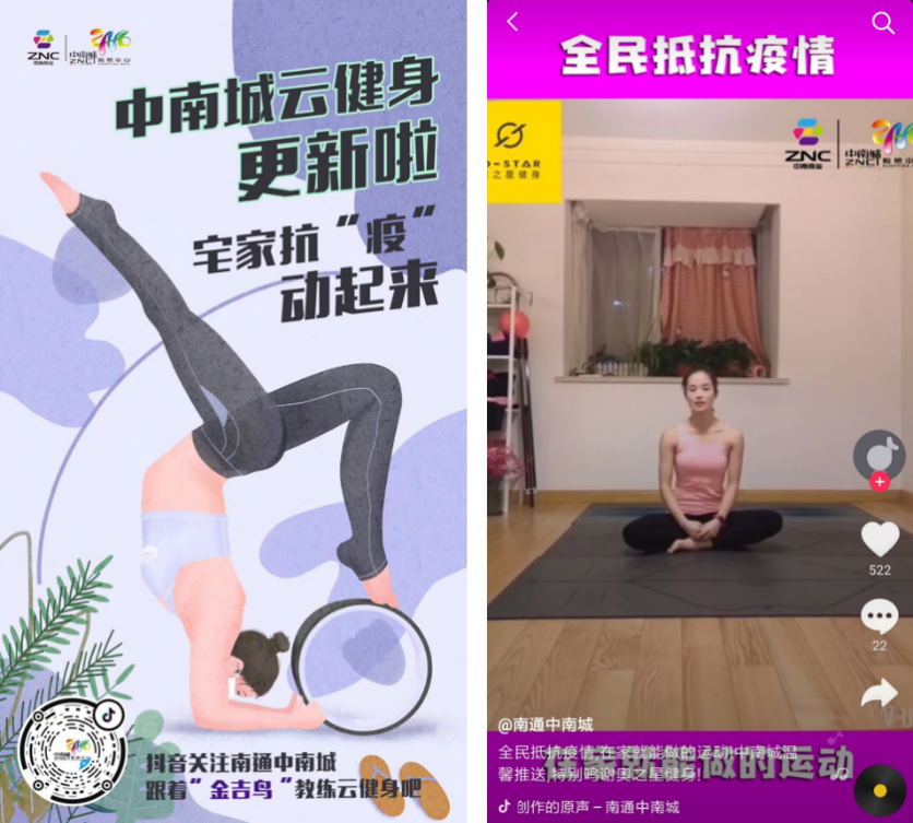 線上,南通中南城主動發(fā)力微信社群、抖音、B站、在線商城等新媒體平臺,結合熱點制作相關短視頻、與粉絲直播互動等,以優(yōu)質內容提升消費者黏性。其中,抖音云k歌、云健身相關線萬次。