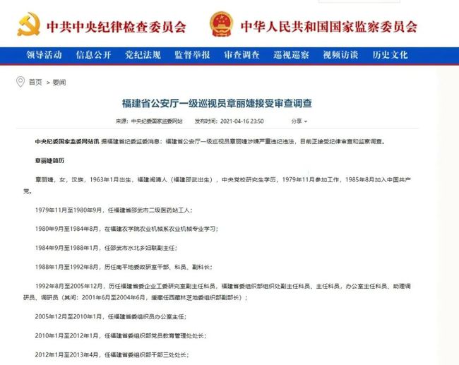中央紀(jì)委國(guó)家監(jiān)委網(wǎng)站訊據(jù)福建省紀(jì)委監(jiān)委消息:福建省公安廳一級(jí)巡視員章麗婕涉嫌嚴(yán)重違紀(jì)違法,目前正接受紀(jì)律審查和監(jiān)察調(diào)查。