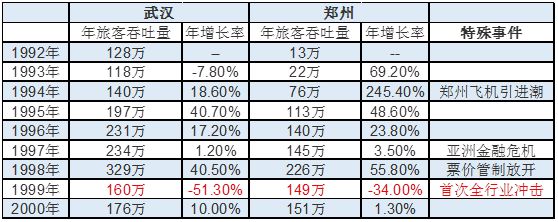 由于機隊增長受限鄭州機場旅客運輸量增速從95年開始放緩,而鄭州的專用民航機場—新鄭機場1997年投入使用后民航業(yè)遭遇了一次較大規(guī)模的沖擊。這些接二連三的打擊,使得2000年時人口接近湖北兩倍、GDP是湖北1.42倍的河南,民航吞吐量只有湖北的85%。