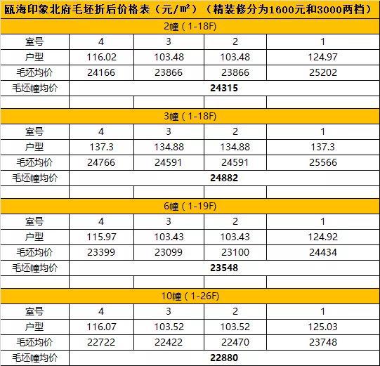 甌海印象北府一期整體折后毛坯均價(jià)23851元/㎡(94折),精裝修標(biāo)準(zhǔn)分為1600元和3000元兩檔(精裝參與折扣)。