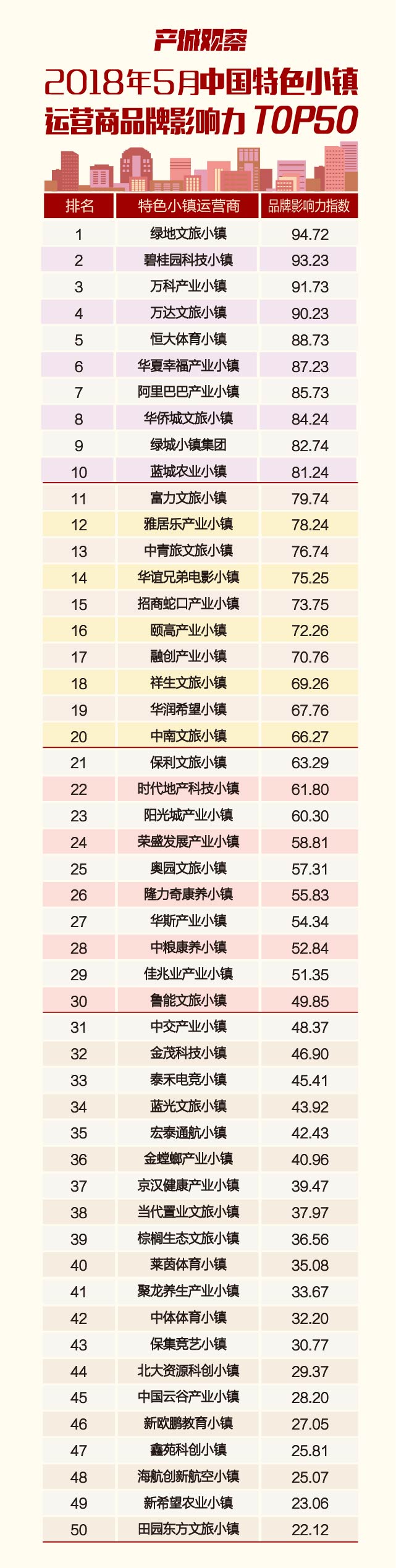 2018年5月中國(guó)特色小鎮(zhèn)運(yùn)營(yíng)商品牌影響力TOP50榜單發(fā)布 影響力指數(shù)呈減小趨勢(shì)
