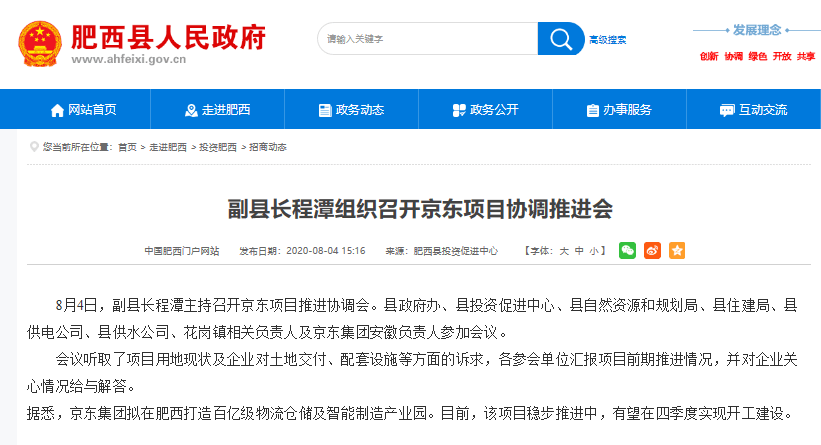 據(jù)悉,京東集團(tuán)擬在肥西打造百億級(jí)物流倉(cāng)儲(chǔ)及智能制造產(chǎn)業(yè)園。目前,該項(xiàng)目穩(wěn)步推進(jìn)中,有望在四季度實(shí)現(xiàn)開工建設(shè)。
