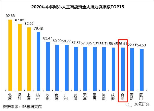 資金支持力度指數(shù)關(guān)注各城市對(duì)人工智能領(lǐng)域發(fā)展建設(shè)的資金支持情況,主要從政府投資和VC/PE投資兩個(gè)方面進(jìn)行考察。資金支持力度指數(shù)排名前三的城市分別為北京、深圳和上海。合肥單項(xiàng)排名第13。
