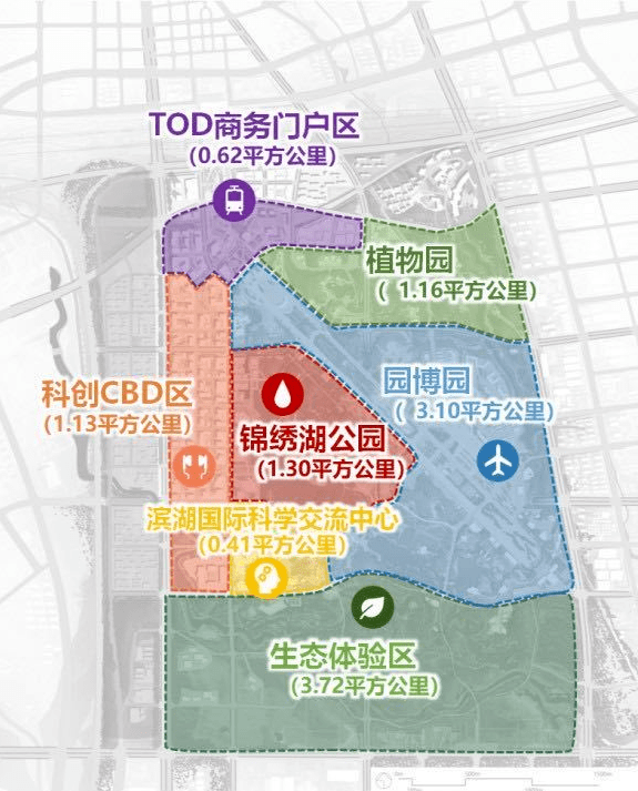 整個(gè)中央公園共劃分為7個(gè)區(qū)域,TOD商務(wù)門戶區(qū)、科創(chuàng)CBD區(qū)、錦繡公園園博園、植物園、濱湖國(guó)際科學(xué)中心、生態(tài)體驗(yàn)區(qū)。