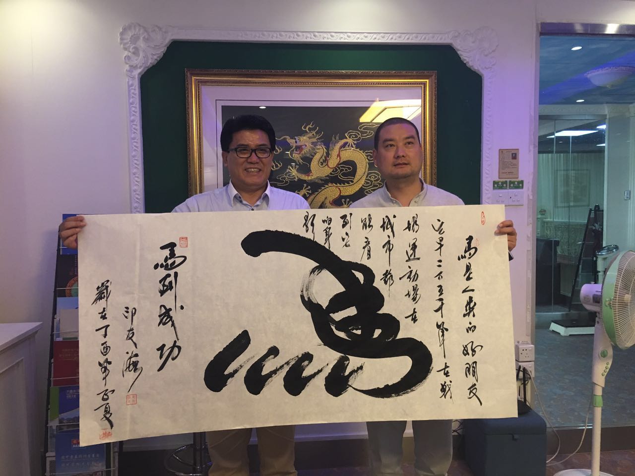 印友海主席精心書寫了兩副書法,贈送給馬永強董事長,意義深刻,祈福祈愿雙方合作愉快,順利發(fā)展。