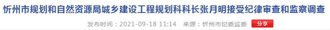 9月18日,忻州市紀(jì)委監(jiān)委通報(bào):忻州市規(guī)劃和自然資源局城鄉(xiāng)建設(shè)工程規(guī)劃科科長(zhǎng)張?jiān)旅魃嫦訃?yán)重違紀(jì)違法,經(jīng)忻州市紀(jì)委監(jiān)委指定,目前正接受原平市紀(jì)委監(jiān)委紀(jì)律審查和監(jiān)察調(diào)查。