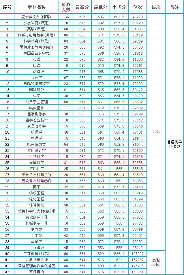 本科招生專業(yè)中,錄取蕞高分625分,來自漢語言文學(xué)(師范)專業(yè),錄取蕞低分553分(工程管理),蕞低分位次95149。