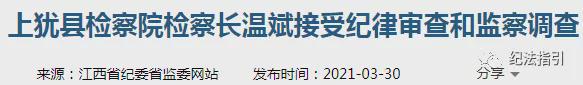 據(jù)江西省紀(jì)委監(jiān)委消息:上猶縣檢察院檢察長溫斌涉嫌嚴(yán)重違紀(jì)違法,目前正接受贛州市紀(jì)委市監(jiān)委紀(jì)律審查和監(jiān)察調(diào)查。