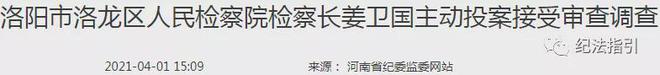 據(jù)洛陽市紀(jì)委監(jiān)委消息:洛陽市洛龍區(qū)人民檢察院檢察長姜衛(wèi)國(副縣級(jí))涉嫌嚴(yán)重違紀(jì)違法,已主動(dòng)投案,目前正接受洛陽市紀(jì)委監(jiān)委紀(jì)律審查和監(jiān)察調(diào)查。
