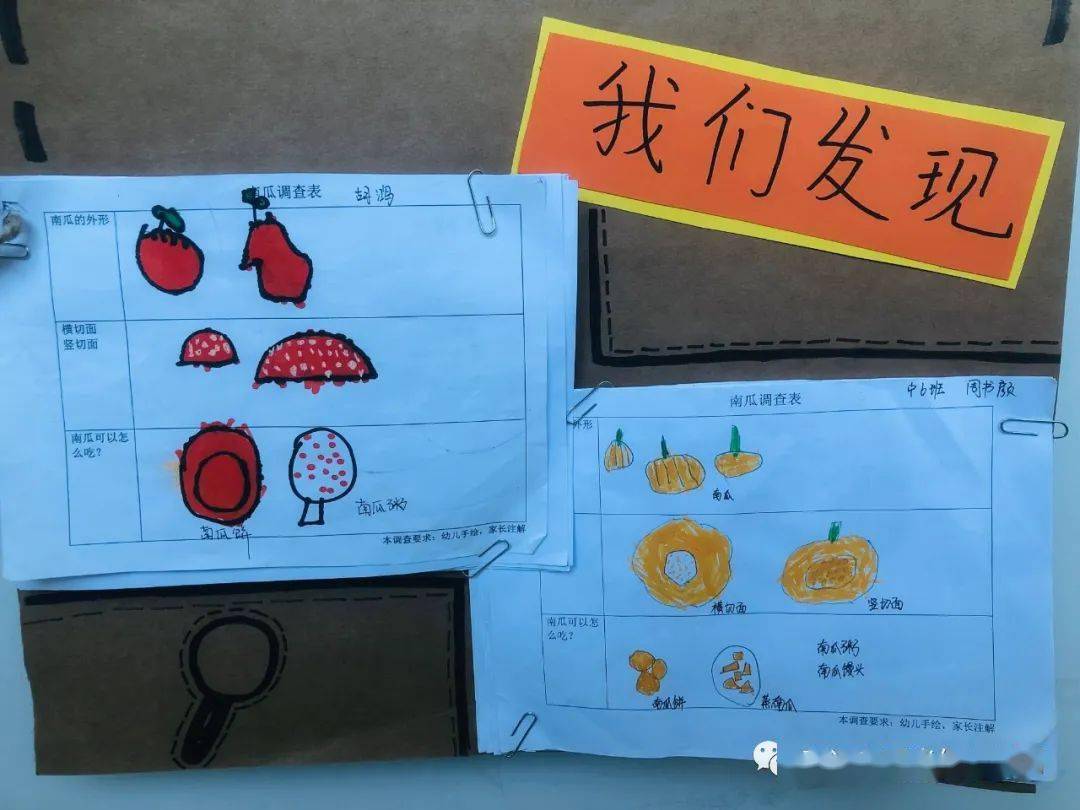 你知道嗎?南瓜有著豐富的種類(lèi)呢!有磨盤(pán)南瓜、蜜本南瓜、黃金南瓜……除了這些,你還知道哪些南瓜呢?我們都在不同的地方見(jiàn)到過(guò)南瓜,南瓜還可以做成許多美食呢!快來(lái)看看我們的調(diào)查表吧!