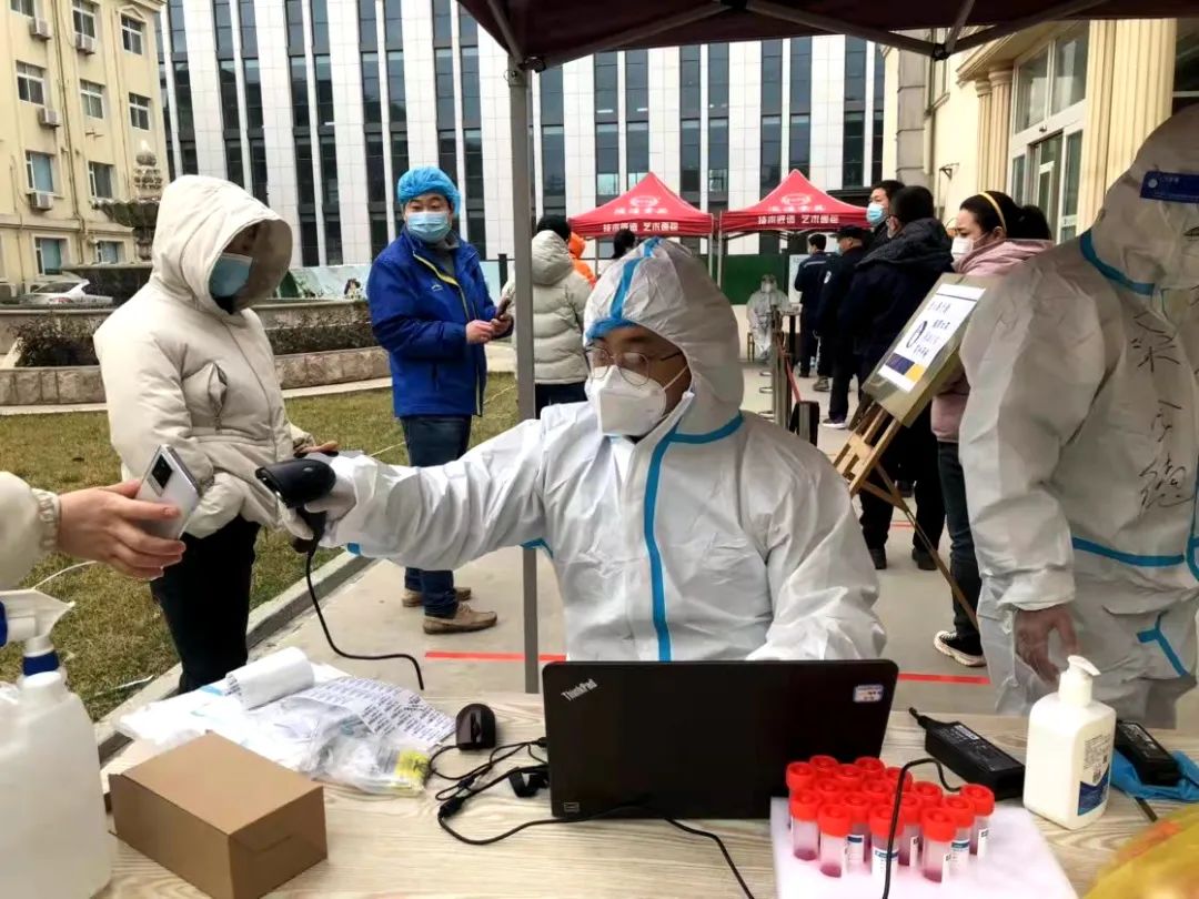 △全體工作人員到鑫豐紡織有限公司開展全員核酸檢測志愿服務,維護現(xiàn)場秩序,幫助員工注冊個人信息,生成檢測二維碼,提高檢測效率。