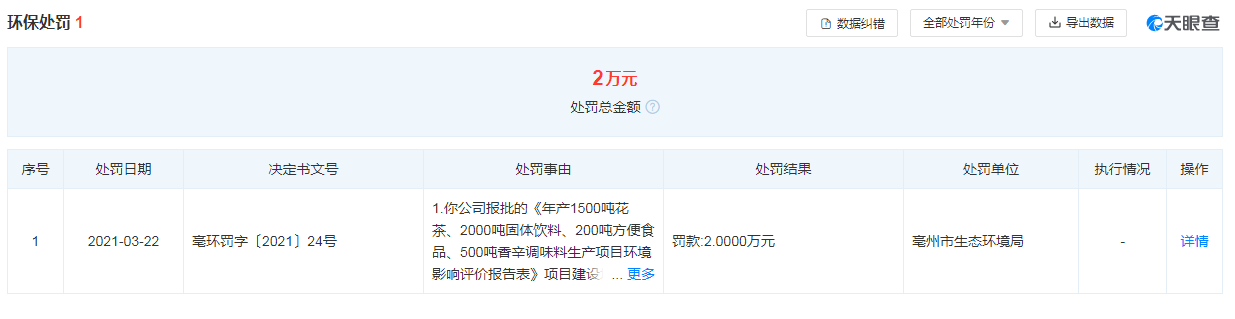 2020年3月,因環(huán)保問題該公司被亳州市生態(tài)環(huán)境局處罰款2萬元,決定書文號(hào)為亳環(huán)罰字〔2021〕24號(hào)。