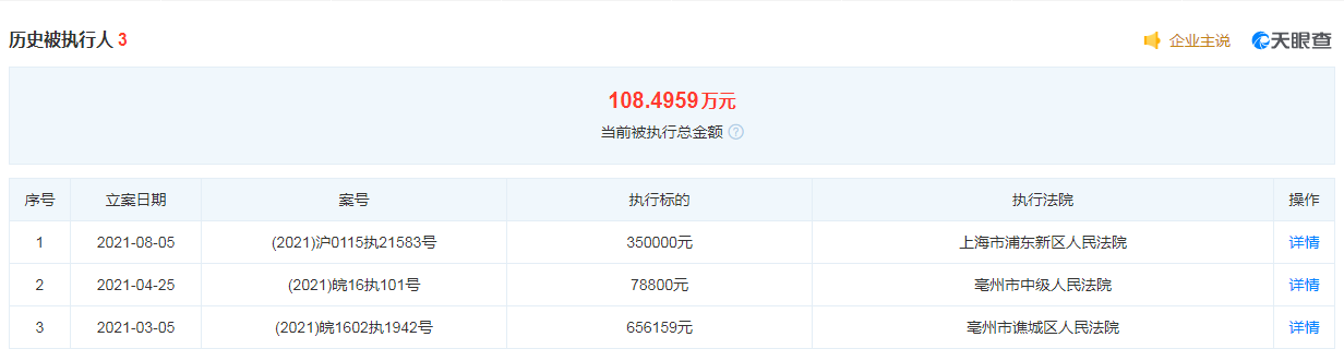 鳳凰網(wǎng)安徽梳理發(fā)現(xiàn),去年一年的時(shí)間里,安徽華國堂生物科技有限公司3次被列為被執(zhí)行人,執(zhí)行標(biāo)的累計(jì)超過108萬元。
