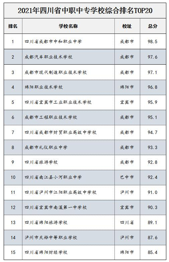 四川省成都市中和職業(yè)中學、成都汽車職業(yè)技術學校、成都市現(xiàn)代製造職業(yè)技術學校、綿陽職業(yè)技術學校等20所中職中專學校入選“2021年四川省中職中專學校綜合排名TOP20”榜單。